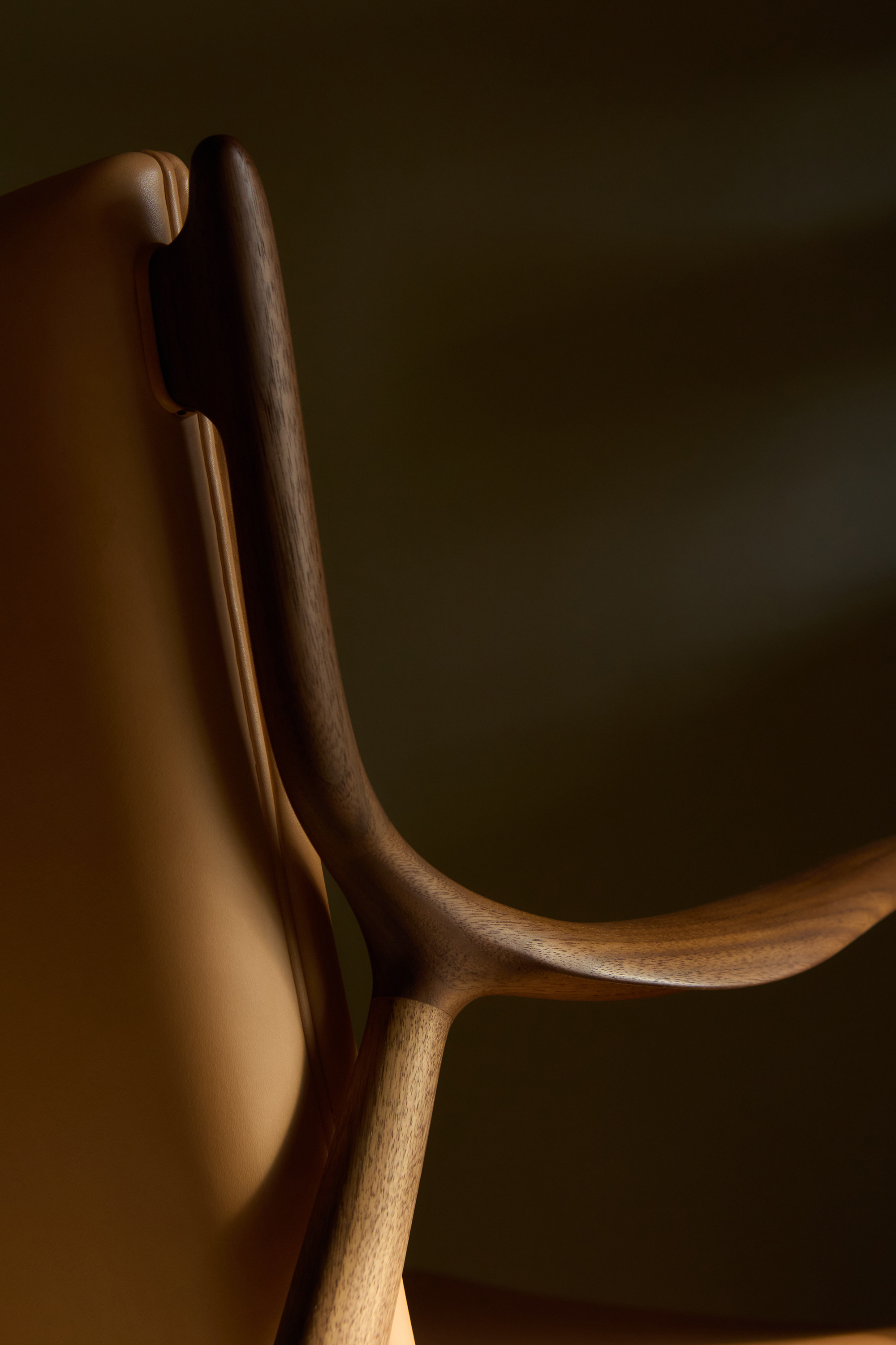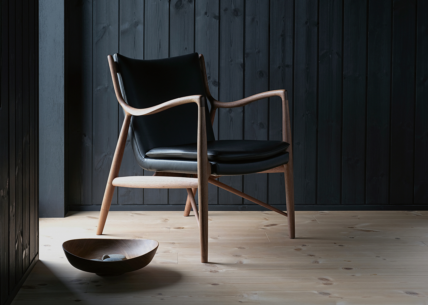 No.45 は、1945 年のコペンハーゲン家具職⼈ギルド展で発表されました。この椅⼦はフィン・ユール デザインの特異さを象徴する代表作であり、デンマークデザインの歴史において⾰新的な作品として広く知られています。
