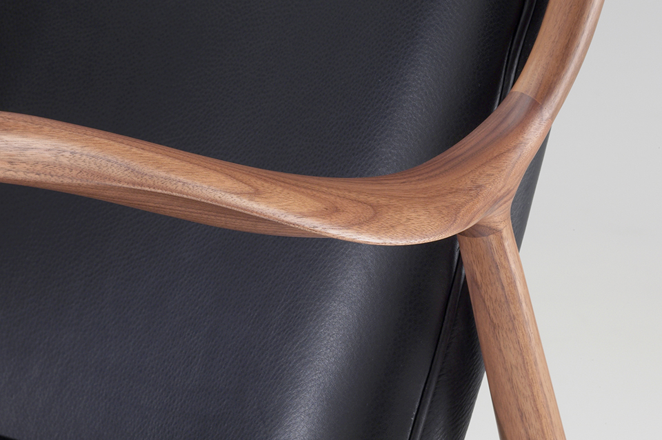 特に、背からアーム、そして前脚へと続くしなやかな木部の曲線はとても優雅で、飛翔する鳥の翼のように軽やかにかつ繊細に職人が削り出したアーム部分は正に秀逸です。