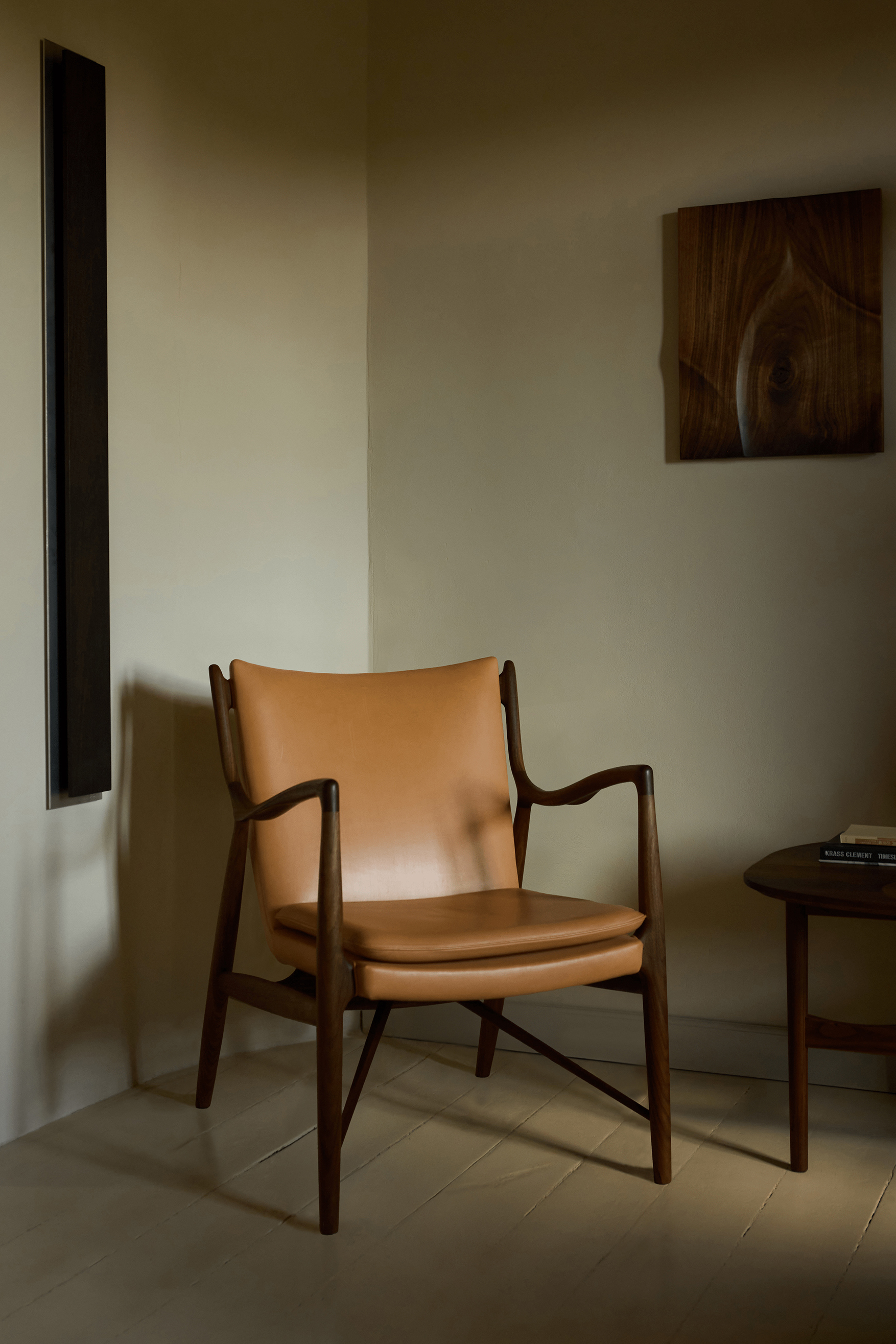No.45 は、1945 年のコペンハーゲン家具職⼈ギルド展で発表されました。この椅⼦はフィン・ユール デザインの特異さを象徴する代表作であり、デンマークデザインの歴史において⾰新的な作品として広く知られています。